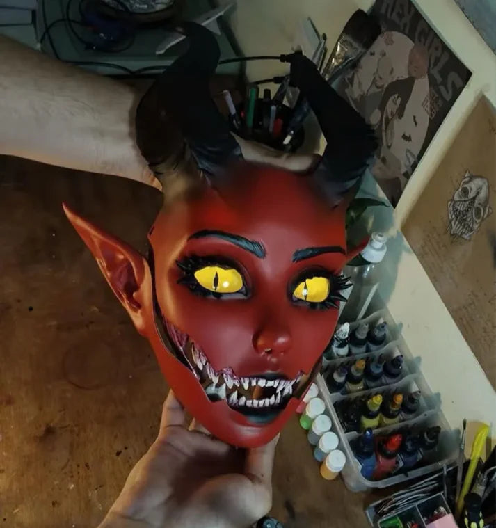 Appearance Style: The mask features a rich demon theme, with a red main body complemented by black curved horns and pointed ears, creating a strong visual impact. It aligns well with fantasy and dark aesthetics, making it ideal for role-playing or artistic displays. Made with high-quality materials, easily adjustable for a comfortable fit.